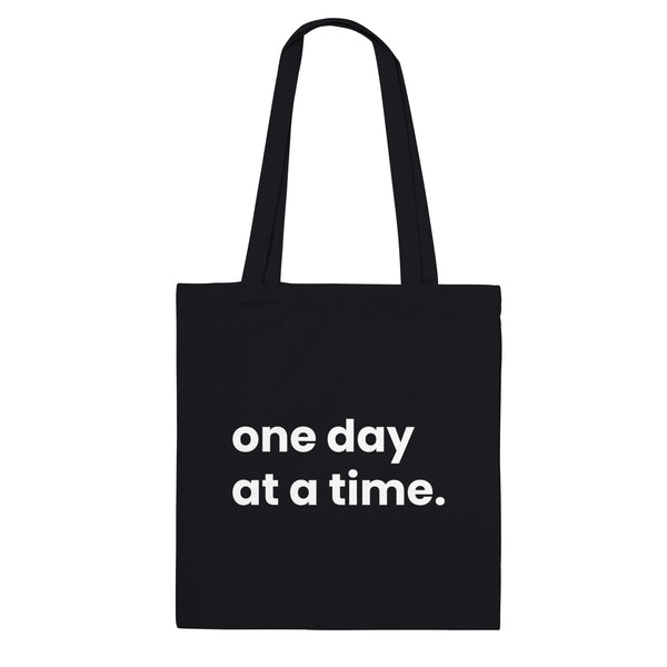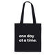 Tasken har den bemyndigende tekst "one day at a time" med fede hvide bogstaver, der tjener som en påmindelse om at tage livet et skridt ad gangen og fokusere på nuet. Denne besked er perfekt til dem, der konstant er på farten og søger motivation og inspiration i deres daglige liv.